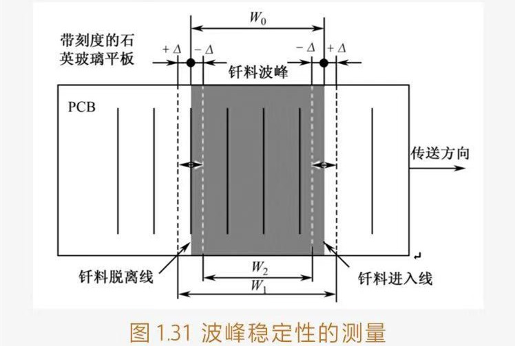 ③測(cè)試方法:將波峰高度調(diào)節(jié)至正常工作的高度H0上,然后將帶刻度的石英玻璃平板裝夾在傳送鏈上,將其運(yùn)行至釬料波峰上調(diào)節(jié)好浸入深度,如圖131所示。觀測(cè)由于波峰高度的波動(dòng)而導(dǎo)致玻璃平板上釬料波峰的進(jìn)入線和脫離線之間闊度的變化[W2(Wo-2△)-Wo-W1(W0+2△)]。