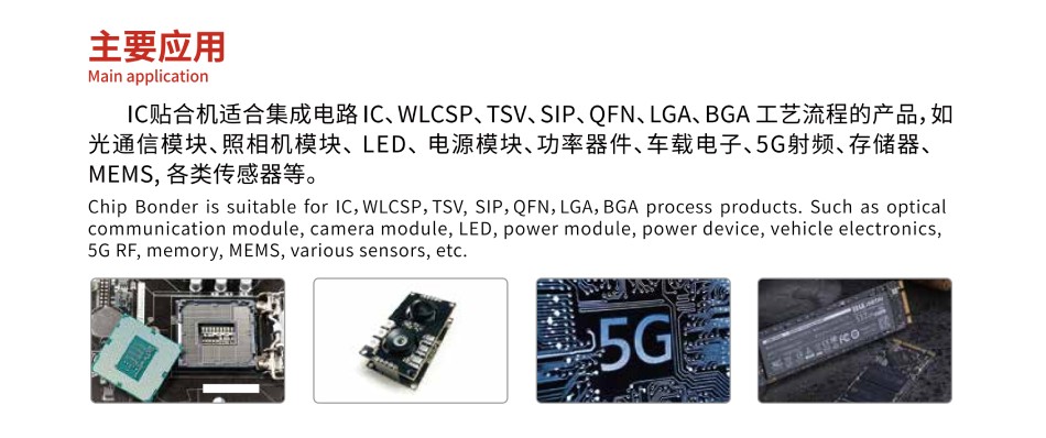 IC貼合機(jī)主要應(yīng)用:IC貼合機(jī)適合集成電路IC、WL CSP、TSV、SIP、QFN、LGA、BGA工藝流程的產(chǎn)品, 如光通信模塊、照相機(jī)模塊、LED、電源模塊、功率器件、車載電子、5G射頻、存儲(chǔ)器、MEMS, 各類傳感器等。