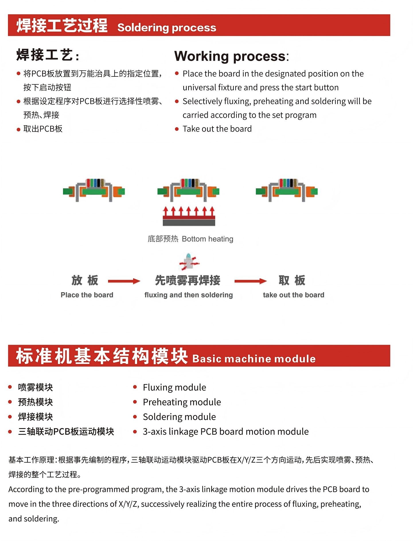 三軸聯(lián)動運動系統(tǒng):手動放板,搭載萬能治具,錫爐固定不動,PCB板在X/Y/Z三軸方向運動,實現(xiàn)焊接;