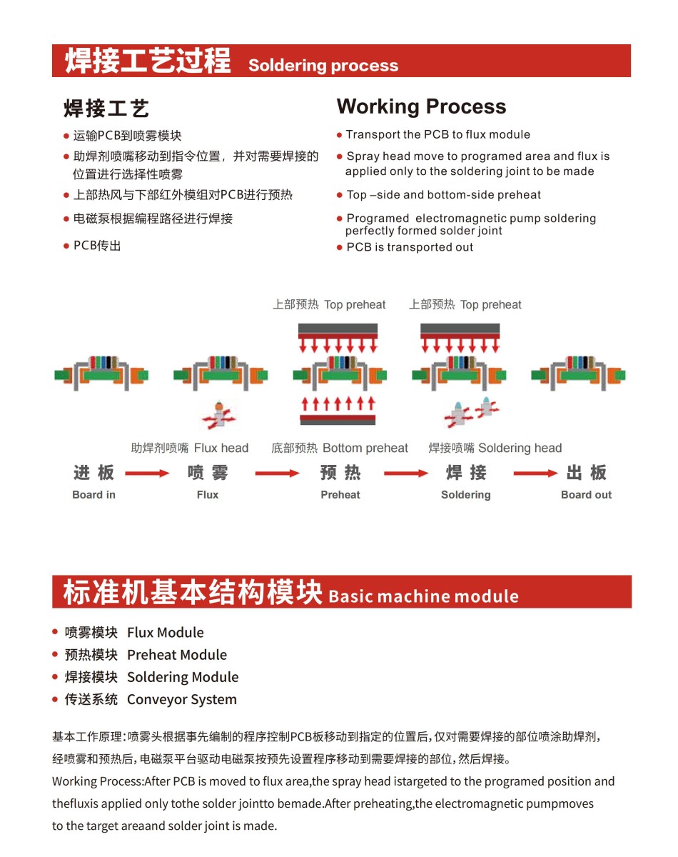 上部熱風(fēng)與下部紅外模組對PCB進(jìn)行預(yù)熱電磁泵根據(jù)編程路徑進(jìn)行焊接