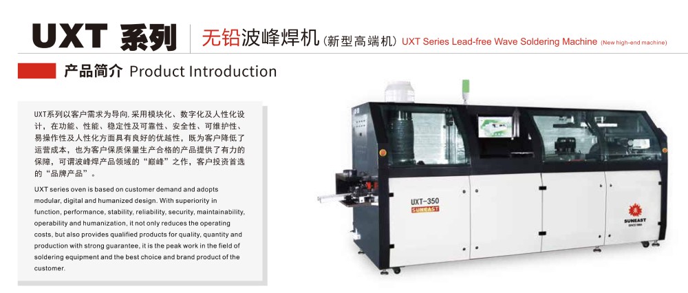 波峰焊UXT系列以客戶需求為導向, 采用模塊化、數字化及人性化設計,在功能、性能、穩定性及可靠性、安全性、可維護性、易操作性及人性化方面具有良好的優越性,既為客戶降低了運營成本,也為客戶保質保量生產合格的產品提供了有力的保障,可謂波峰焊產品領域的“巔峰”之作,客戶投資首選的“品牌產品”。